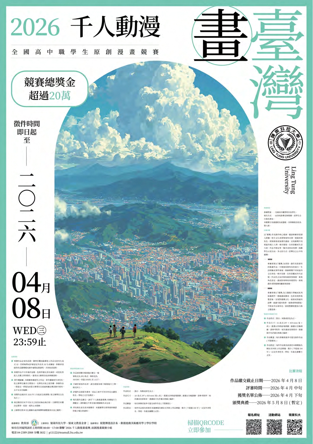 一、為鼓勵全國高中職學生投入動漫與插畫創作,培育具備原創能力、敘事思維與視覺表現力之新世代創作者,本校特辦理 2026「千人動漫畫臺灣」全國高中職學生原創競賽。本競賽設有「漫畫組」與「插畫組」,以「臺灣」為核心主軸,引導學生透過漫畫敘事或插畫意象,描繪屬於臺灣的多元樣貌與時代精神。