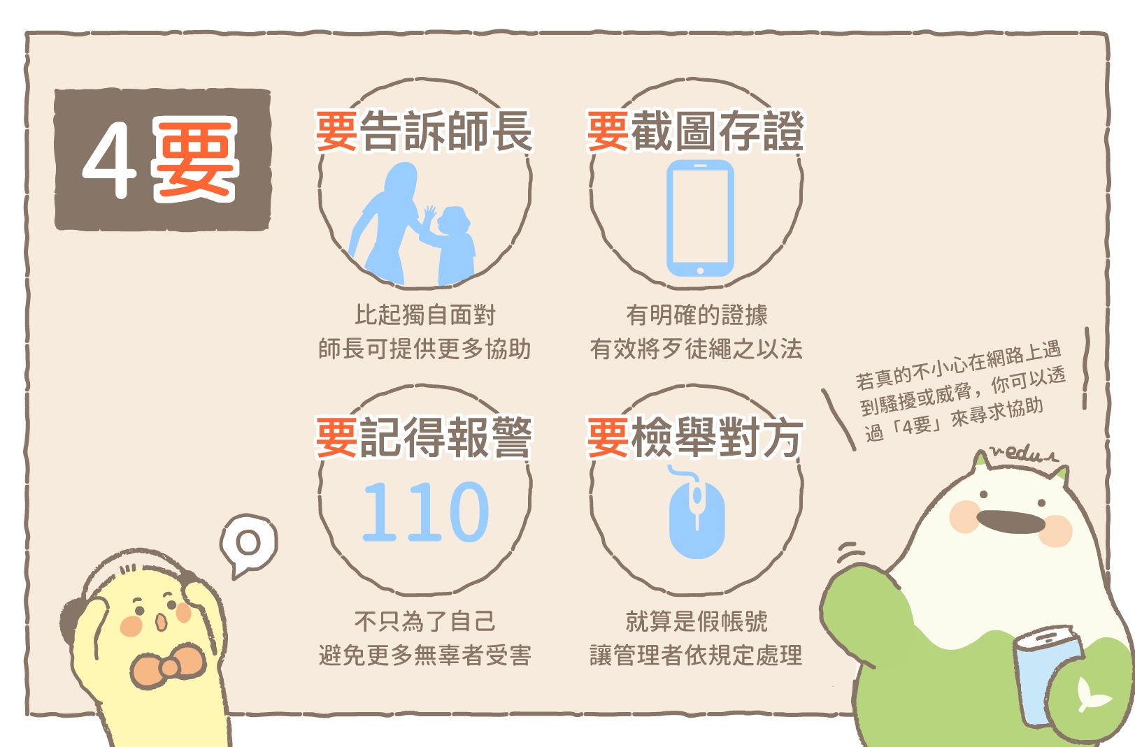 (2)「四要」則包括要告訴師長,要截圖存證,要記得報警,要檢舉對方。
