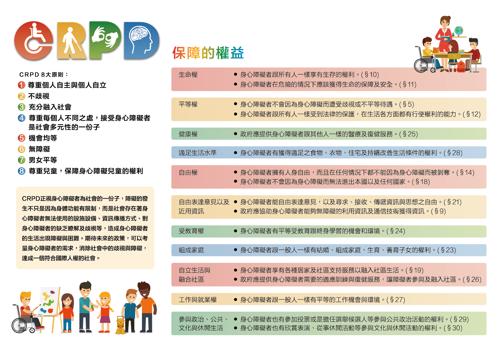 1.身心障礙者權利公約(CRPD) 是聯合國於2006年通過的一項人權公約,旨在促進、保護和確保身心障礙者享有所有人權和基本自由。 它強調身心障礙者與非身心障礙者享有平等權利,並鼓勵社會各界共同努力,營造更友善、共融的環境。