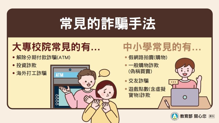 1.目前詐騙手法多變,詐騙案件層出不窮,為避免更多學生遭受詐騙,學校以多元管道進行反詐騙宣導,提高學生警覺能力。另近期社會各界對於詐騙車手問題重視,為避免學生涉詐,學校亦加強法治教育,提升學生法治觀念。