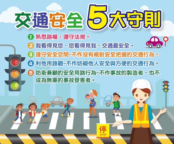 2.行人道路安全:穿越道路時請遵守交通號誌指示或警察之指揮,不任意穿越車道、不滑手機過馬路、闖紅燈,不任意跨越護欄及安全島,不侵犯車輛通行的路權。